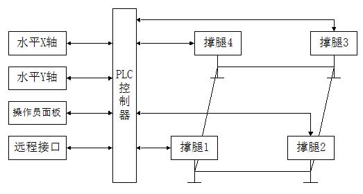 2)自动调平,避免人为误动。当可编程控制器PLC发现工作平台的倾角超出要求时,根据调平算法,指令控制系统驱动执行机构,根据调平算法进行自动调平。