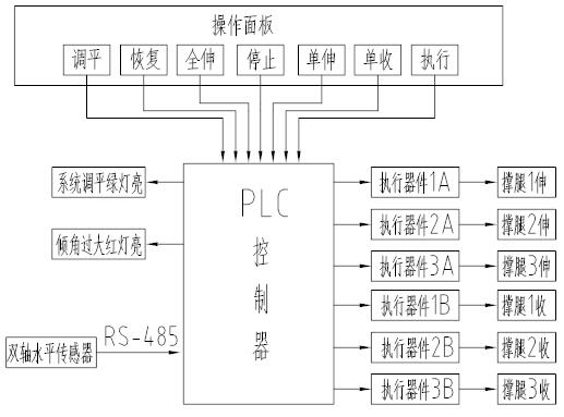 可编程控制器PLC根据双轴水平检测器测出的工作平台的倾角,来控制执行机构的动作和位移,因而,采用闭环调平算法很容易实现工作平台的自动调平。