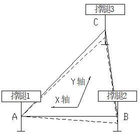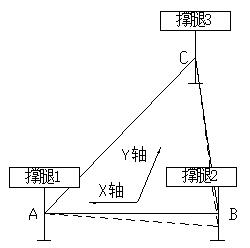 在X轴水平后,调平撑腿1、2不动,调平撑腿3上升一定位移,即工作平台绕轴线AB旋转,如图5所示。上升的数值由控制系统,根据双轴水平检测器的Y轴方向反馈值决定,直至Y轴方向调平。