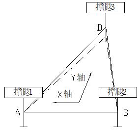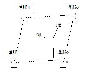可编程控制器PLC接收水平传感器反馈的X轴和Y轴的角度信息,根据自动调平算法,可以测算出工作平台的最高点。假设液压撑腿着地后A点(撑腿1)为最高点。如图13。以水平面为基准,从A点向D点方向作水平线,从B点向C点方向作水平线。此时: