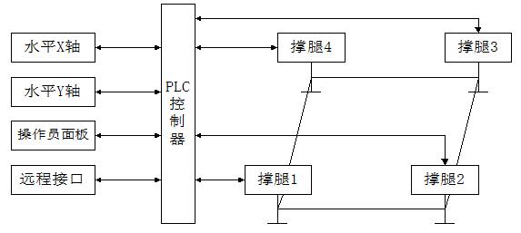 (1)开环调节,即计算出其他三点和最高点的高度差,可编程控制器PLC控制各调平撑腿运行至相应高度,实现工作平台调平。