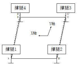 同步调整工作平台的C点(撑腿3)和D点(撑腿4),使两条撑腿同时上升DD'长度。此时AD和AD'重合,BC和BC'重合。则工作平台在Y轴方向处于水平状态。
